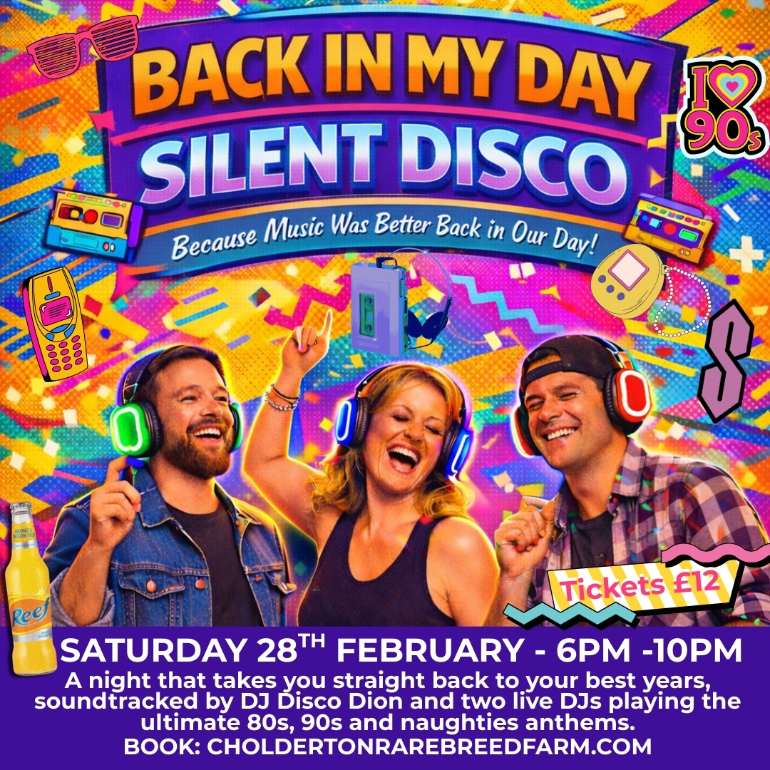 Remember when music was better, nights were longer, and dancing didn’t require a recovery plan? Welcome to our Back In My Day Silent Disco hosted by Disco Dion, a grown-ups-only night at the farm where you can relive the soundtrack of your youth without the late night regrets. Pop on a pair of wireless headphones and switch between three live DJs, each spinning the best of the 80s, 90s and naughties. From singalong classics to guilty pleasures, this is your chance to dance like you used to, just with a slightly earlier finish! The bar will be pouring the classic drinks that fuelled your youth. What to expect: 🎧 Silent disco with three DJs 🎶 80s, 90s and naughties channels 💃 Dance the night away 🍔 Food and drink available 🏡 Option to stay over 😴 Early to bed vibes! Gather your friends, relive the good old days, and still be home at a sensible hour. Book now and grab your headphones!