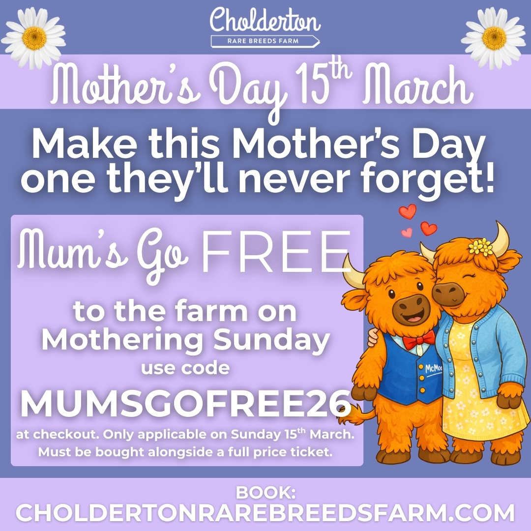 You know what most mums actually want for Mother’s Day on Sunday 15th March? Time together. No cooking. No organising. No stress. If you’re wondering how to spoil her this year, make it a day she’ll genuinely enjoy. Fresh air, baby animals, to be cooked for, countryside views and a proper family day out. MUMS GO FREE on Mothering Sunday, 15th March Use code MUMSGOFREE26 at checkout when booking alongside a full price ticket.
